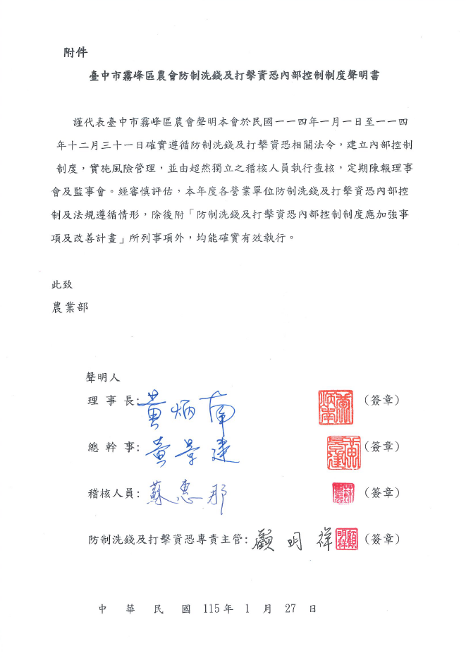 【公告】霧峰區農會防制洗錢及打擊資恐聲明書(114年)