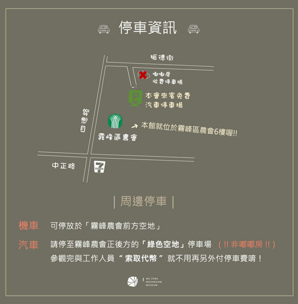 • 購票位置位於本會 6F 霧峰菇類產學館售票處,參觀之來賓請先購票在入場。