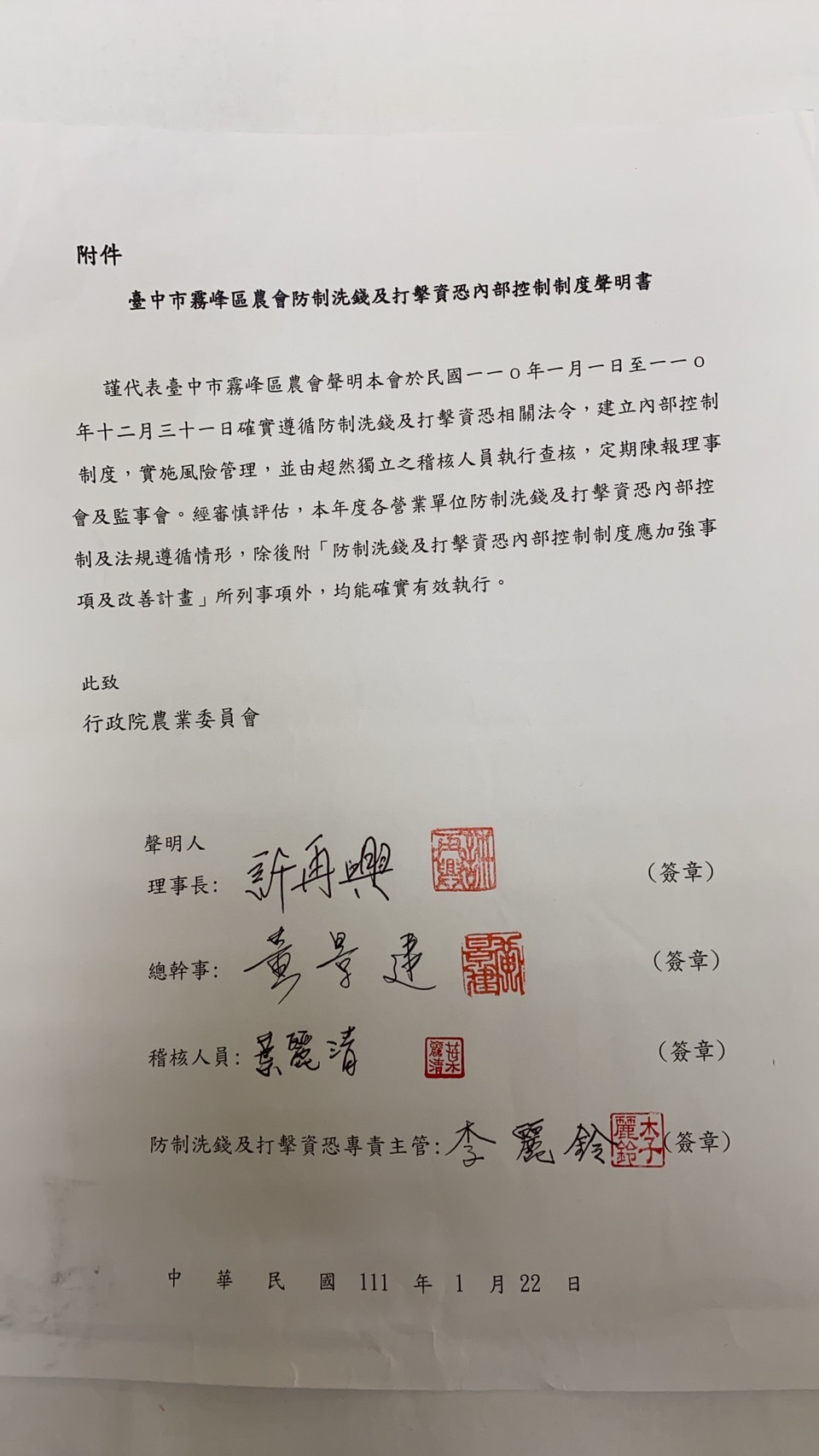 【公告】霧峰區農會防制洗錢及打擊資恐聲明書