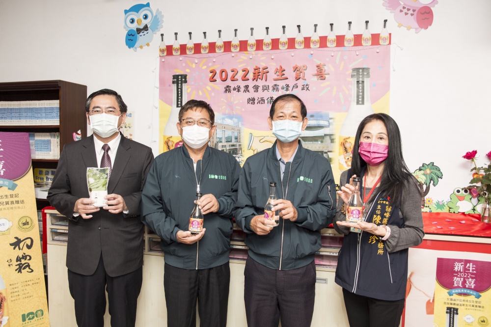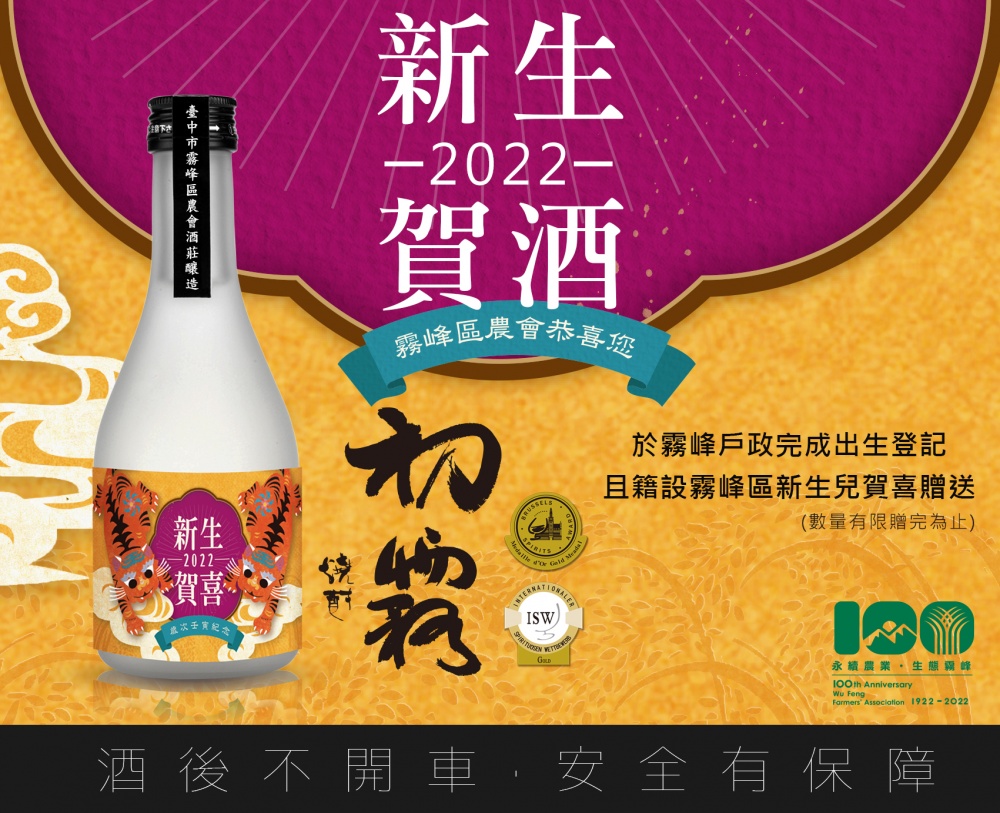 霧峰區農會酒莊生產的酒品,屢次奪得國際金銀牌大獎,尤其「初霧燒酎」更是國際酒品賽事的常勝軍。今年適逢霧峰區農會創會一百周年,農會為回饋地方,發揮公益的宗旨與企業責任,特別結合霧峰區戶政事務所,響應鼓勵生育政策,企劃推出「2022壬寅虎年新生賀喜紀念酒」,即日起至111年12月31日止,在戶政事務所完成霧峰區新生兒登記者,即可獲得一瓶霧峰區農會精釀的金牌新生賀喜酒。
