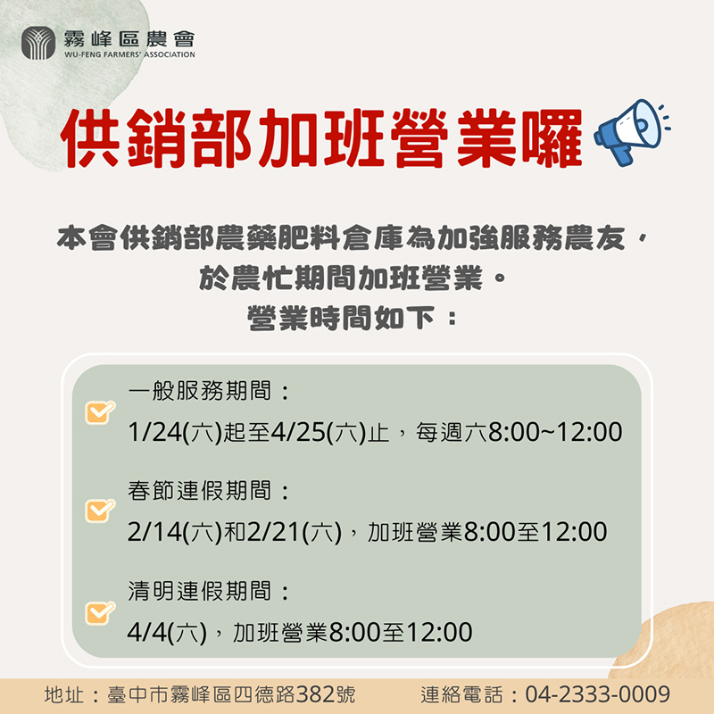 【公告】115年供銷部農藥肥料倉庫農忙期間加班營業。